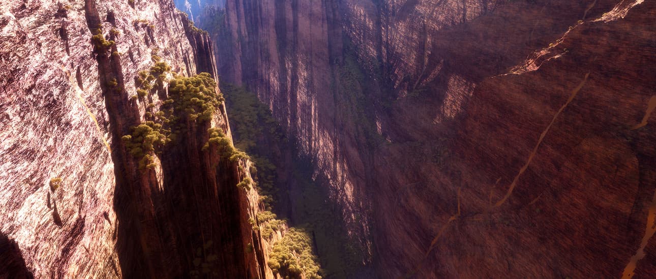 L’Ékobit, lieu magnétique de la région de Tamboulbit, est une immense faille séparant l’Île-continent en deux. À ciel ouvert, elle fait dans les trois cents kilomètres de large et plusieurs kilomètres de profondeur. Dans le passé de la Forêt Epopée, il y avait un bras de mer qui y coulait et facilitait la navigation entre les deux rives. Et puis l’eau disparut et on appela cet endroit la Montagne à l’envers.